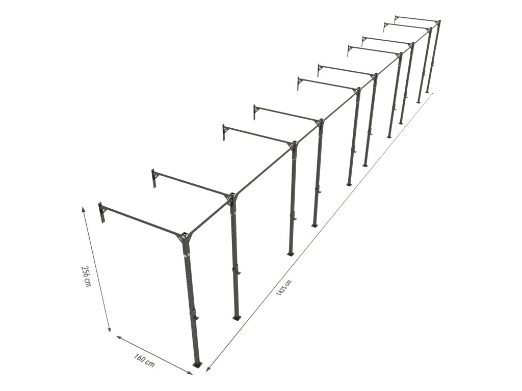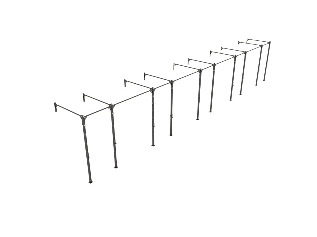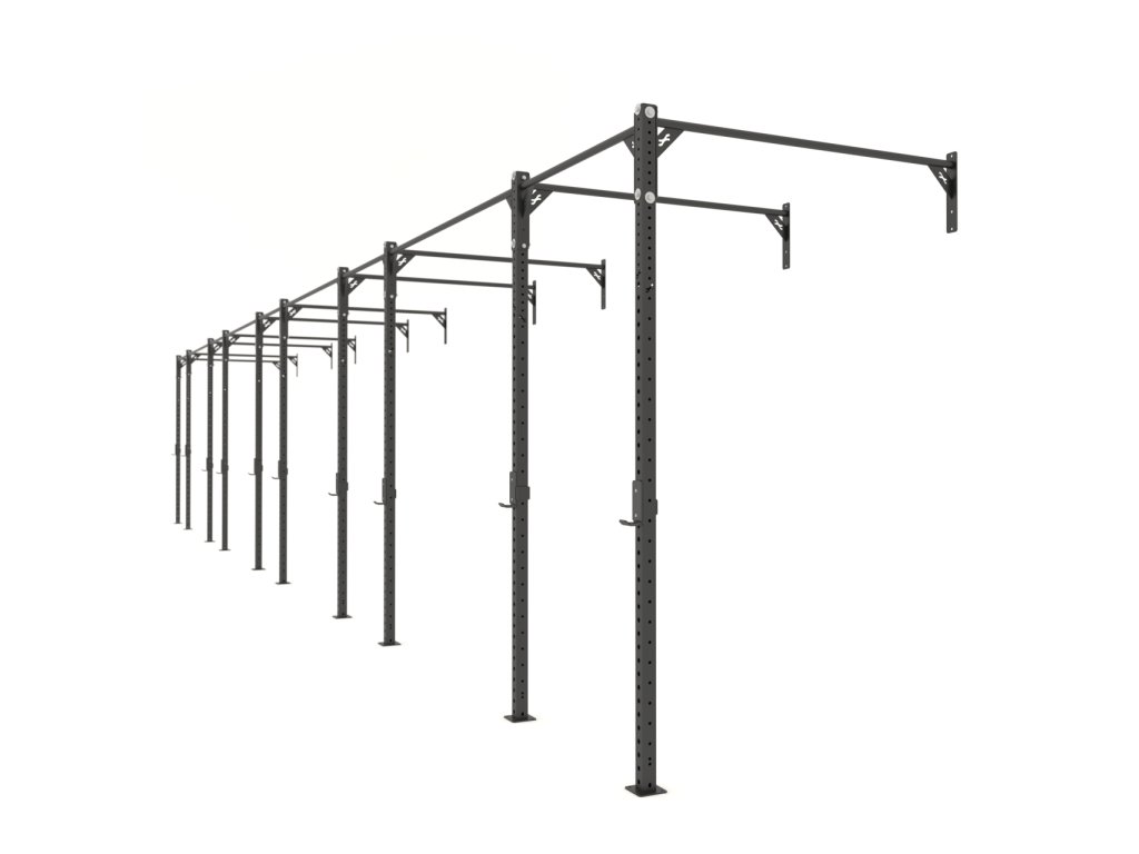 RIG 10-stĺp Wallmount je pevná konštrukcia, ktorá v sebe spája hrazdu, drepovací či stojan na benchpress a možnosť pre upevnenie bradiel. Konštrukcia pozostáva z dvoch nosných stĺpov, z ktorých má každý 37ks 18mm dier pre upevnenie rôzneho príslušenstva (bradlá, RIG stojan, J-háčiky atď.) a 12 párov 12mm dier v rôznych výškach od 195 do 250cm pre upevnenie hrázd.