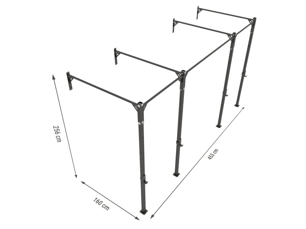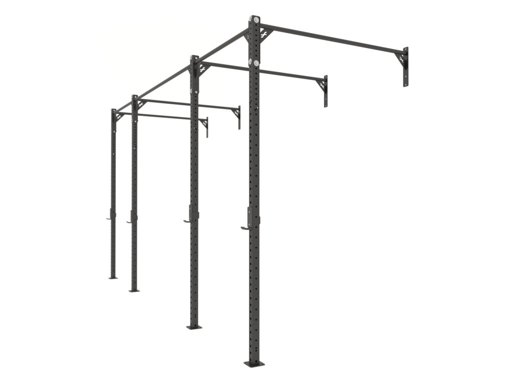 RIG 4-stĺp Wallmount je pevná konštrukcia, ktorá v sebe spája hrazdu, drepovací či stojan na benchpress a možnosť pre upevnenie bradiel. Konštrukcia pozostáva z dvoch nosných stĺpov, z ktorých má každý 37ks 18mm dier pre upevnenie rôzneho príslušenstva (bradlá, RIG stojan, J-háčiky atď.) a 12 párov 12mm dier v rôznych výškach od 195 do 250cm pre upevnenie hrázd.