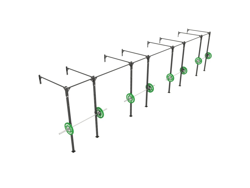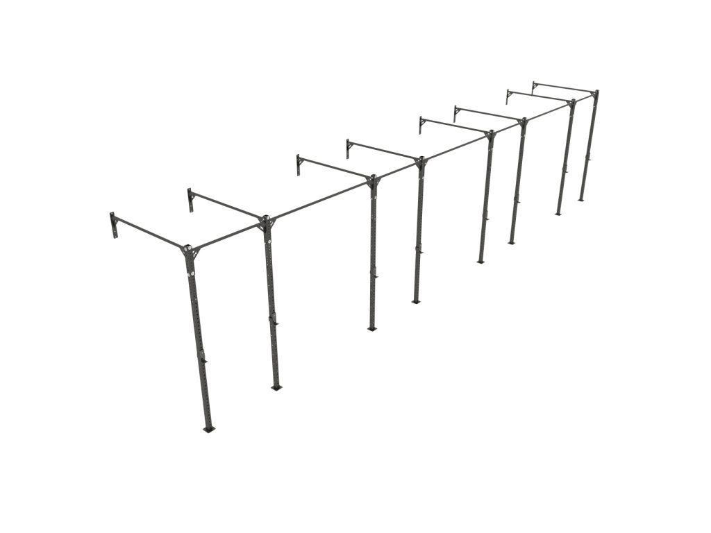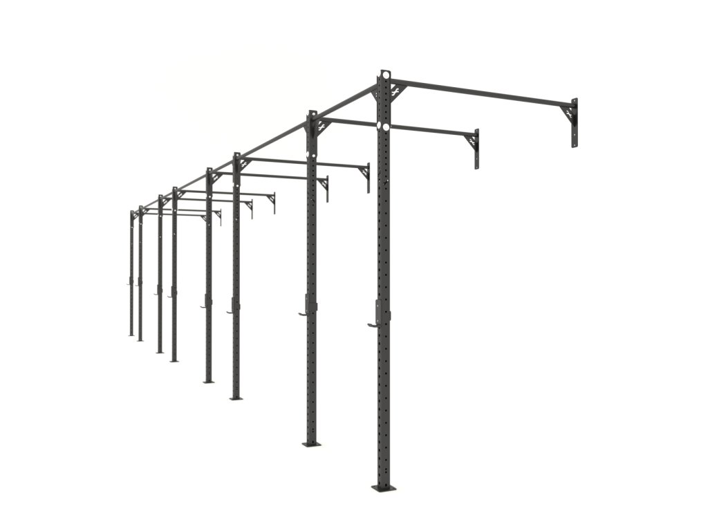 RIG 8-stĺp Wallmount je pevná konštrukcia, ktorá v sebe spája hrazdu, drepovací či stojan na benchpress a možnosť pre upevnenie bradiel. Konštrukcia pozostáva z dvoch nosných stĺpov, z ktorých má každý 37ks 18mm dier pre upevnenie rôzneho príslušenstva (bradlá, RIG stojan, J-háčiky atď.) a 12 párov 12mm dier v rôznych výškach od 195 do 250cm pre upevnenie hrázd.